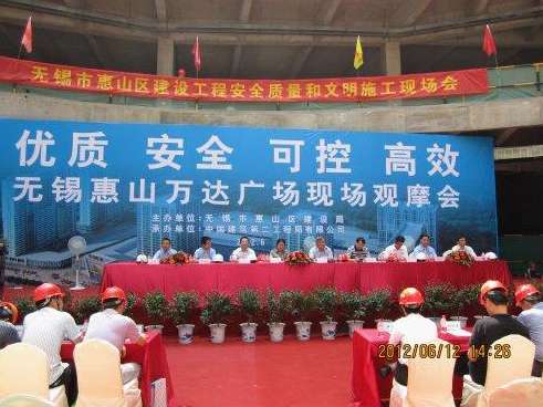 12日下午,區建設局在惠山萬達項目現場召開了惠山區2012年安全質量和文明施工現場會。各鎮、街道、園區分管鎮長(主任),村建站、園區規劃建設部負責人,區內建筑施工企業總承包負責人、項目經理,承接區內建筑施工的區外企業項目經理,各監理企業負責人和房產項目負責任人500多人參加現場觀摩會。