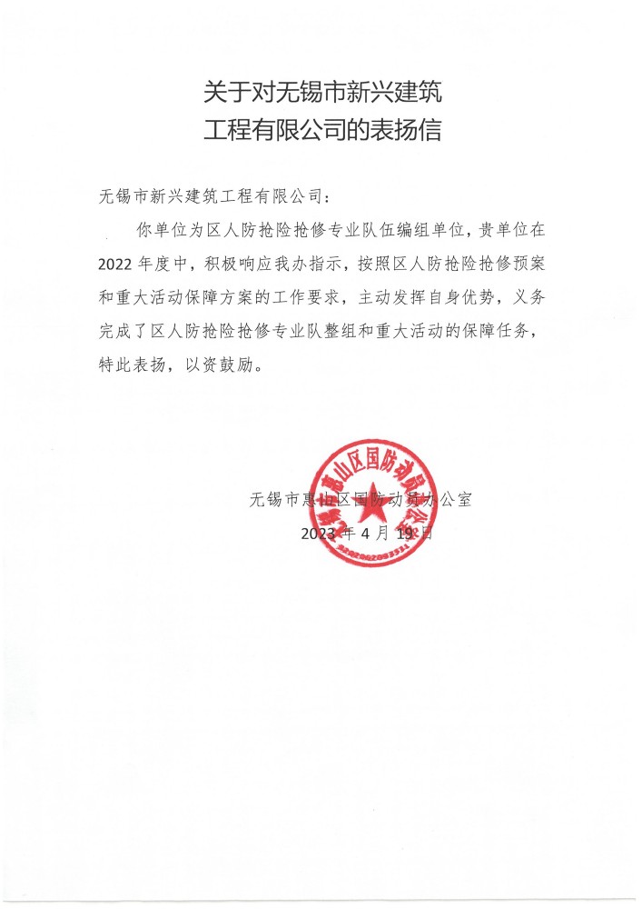 2023.04 人防搶險(xiǎn)搶修2022年度表揚(yáng)信