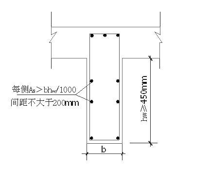 1.7 梁腹板高度hw≥450mm時,應在梁兩側面設置腰筋,鋼筋直徑不應小于12mm,每側腰筋配筋率As>bhw/1000,間距不大于200mm如圖7.1.1-2所示。