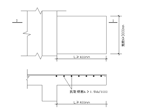 1.6 室外懸臂板挑出長度L≥400mm、寬度B≥3000mm時,應配抗裂分布鋼筋,直徑不應小于6mm,間距不應大于200mm,抗裂分布筋如圖7.1.1-1所示。